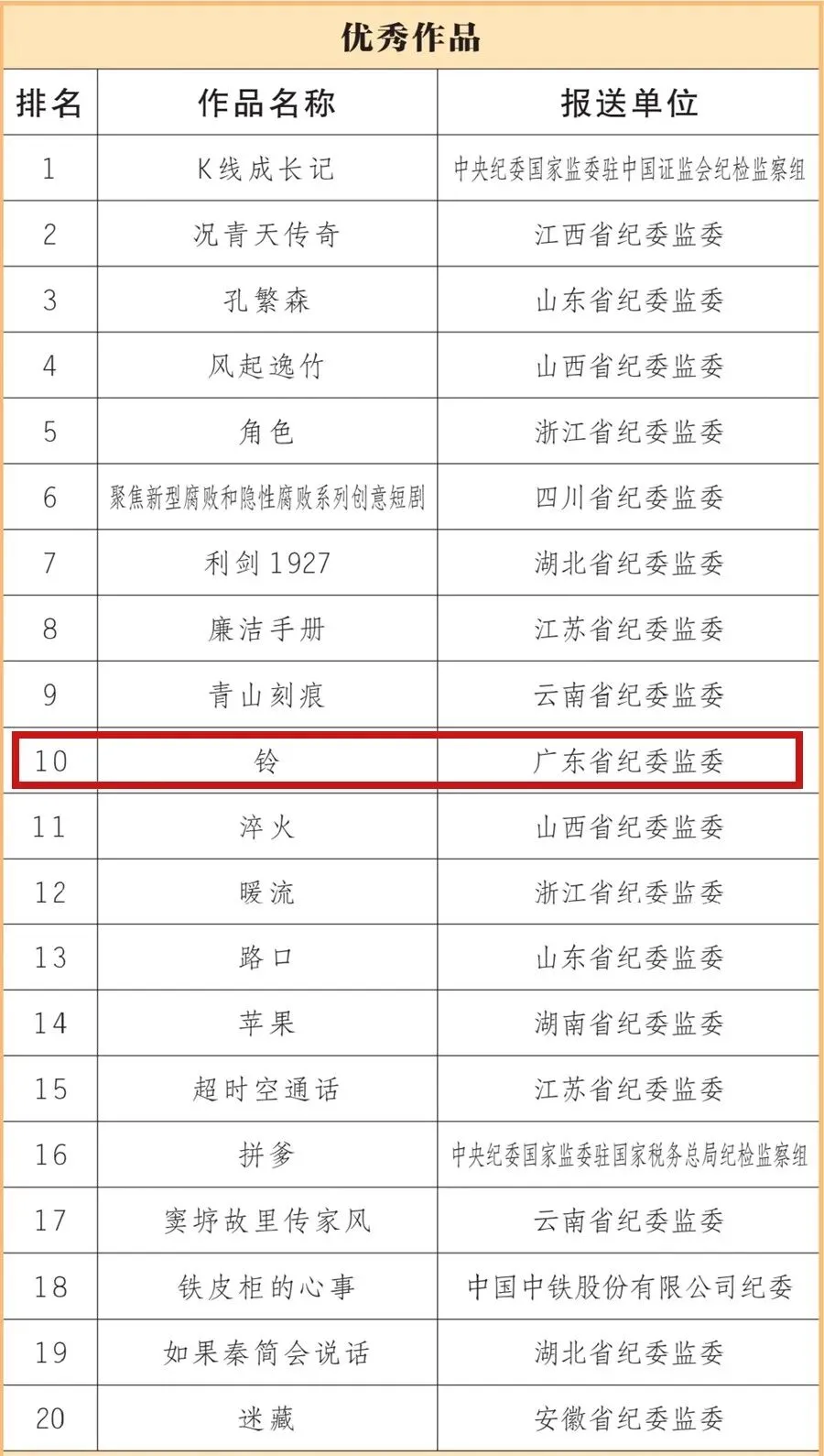 近日,由中央纪委国家监委宣传部、中央宣传部文艺局、中央网信办网络传播局联合主办,人民网承办的新时代廉洁文化微短剧征集展播活动,公布了20部优秀作品、40部入围作品(名单附后)。其中,由深圳市福田区纪委监委原创制作的参赛作品《铃》被评为优秀作品。