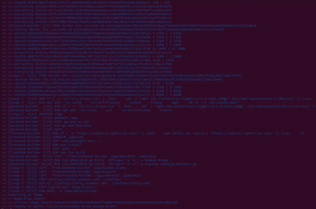 前面我们介绍了oii来生成短剧,效果确实不错,但是其营销和manus一样,采用邀请码的方式进行,因此很多用户因为这个无法体验,目前也商业化了,可能人数上来了,每天的费用不低,哈哈,我也理解。但是别着急,今天我给大家介绍一个开源免费、支持私有化部署的短剧生成平台--火宝短剧平台。火宝是一个基于 AI 的短剧自动化生产平台,实现从剧本生成、角色设计、分镜制作到视频合成的全流程自动化。嘿嘿,如果你是视频创作者,那这简直是你的福音呀,还等什么,赶紧动起来。角色管理 : AI 生成的角色肖像 、批量角色生成、角色图片上传与管理;故事板制作:自动生成故事板脚本、场景描述和镜头设计、故事板图像生成(文生图)、帧类型选择(第一帧/关键帧/最后一帧/面板);视频生成:自动图像转视频生成、视频构图和剪辑、过渡效果;资产管理:统一资产管理、本地存储支持、资源导入/导出、任务进度跟踪。现在我们按照官方的步骤部署,这里我们采用最简单的方式,docker部署。# Enable Docker Hub mirror (recommended)DOCKER_REGISTRY=docker.1ms.run/# Enable npm mirrorNPM_REGISTRY=https://registry.npmmirror.com/# Enable Go proxyGO_PROXY=https://goproxy.cn,direct# Enable Alpine mirrorALPINE_MIRROR=mirrors.aliyun.com
