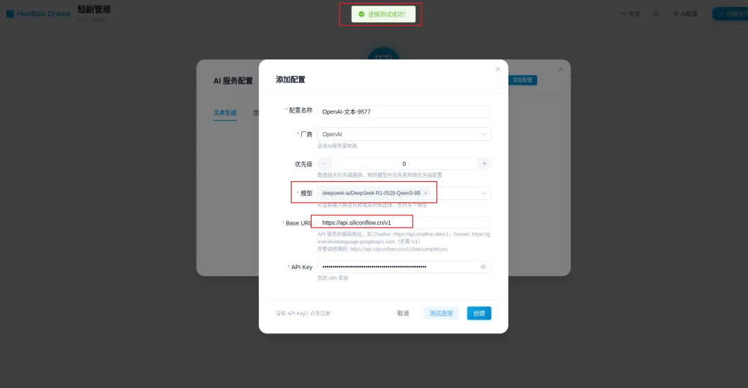 先配置模型API地址,选择模型,文字,生图,生视频,只配置一遍即可(这里可以用字节或者阿里的一些模型,如果你自己有部署也可以试试),这里我都是基于硅基流动的api去配置。