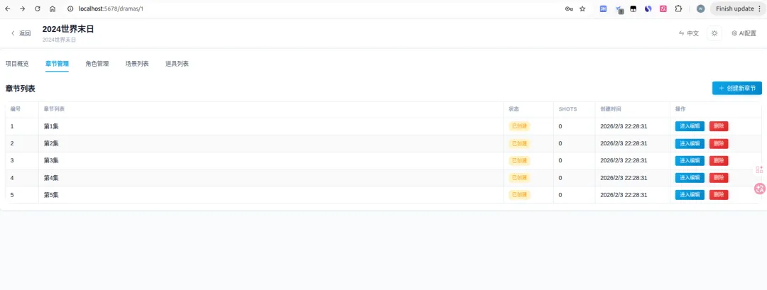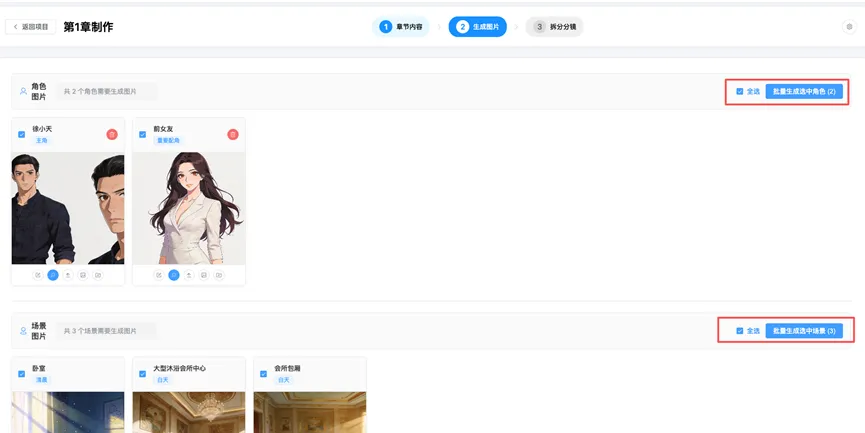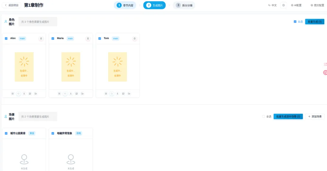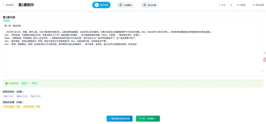 把大模型生成的剧本复制到这里面去,形成一个章节,然后我们点击提取场景和角色。从上图可以看到,就开始生成角色和场景了,至于这些图片生成的好与差完全取决模型的能力。
