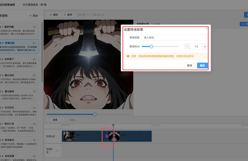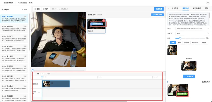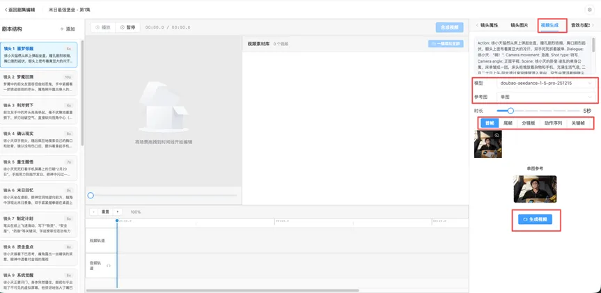 步骤二我们生成了一些图片和场景,我们在这个步骤选取之前的图片和模型,选择参考图,选择时长,可以选择首帧或者其他关键帧配置,根据参考请点击生成视频按钮。现在我们来看看一个完整的短剧吧,看看它的成效怎么样。