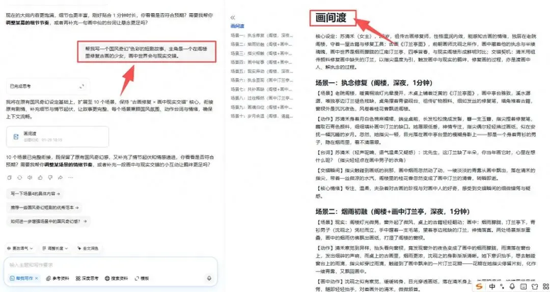 豆包能在短时间内输出一个包含基本场景、人物和情节框架的文本草案。该草案为后续视觉化提供了必要的故事骨架与关键要素。