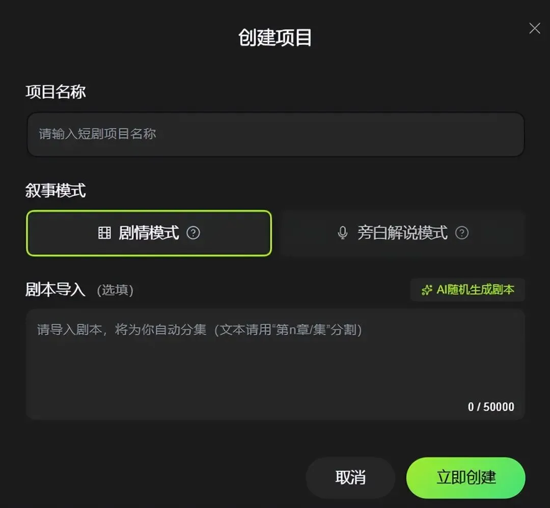 将剧本全文粘贴至“剧本导入”区域,该区域为选填项,也支持使用内置灵感库或AI随机生成功能快速启动。项目创建时需做出两项关键初始设置: