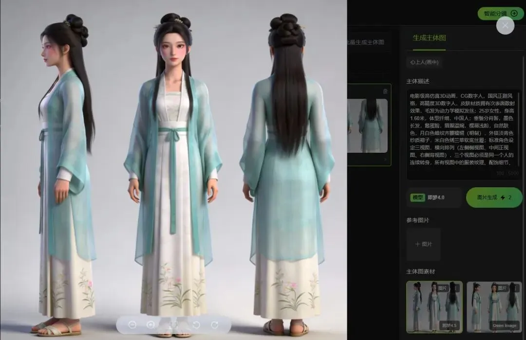 进入角色生成环节,系统会为每个识别出的角色自动撰写生图提示词,并默认提供生成 “三视图”(正面、侧面、半身) 的选项。这是保障角色在后续多镜头中保持面容、发型、服饰一致性的关键技术,能有效避免“角色崩坏”问题。
