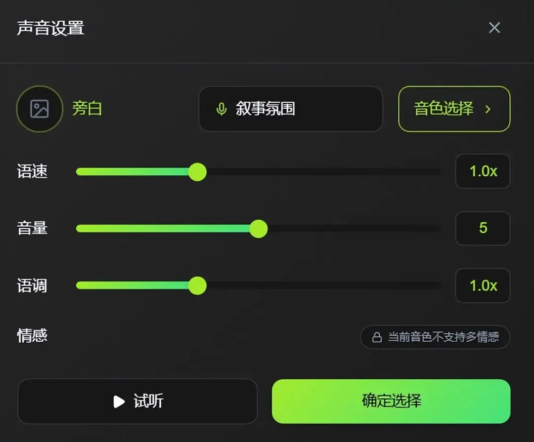 声音配置在此阶段同步完成。系统会为角色推荐适配音色,同时提供超过100种音色的库供手动选择与试听。选定音色后,可进一步微调语速、语调等参数。