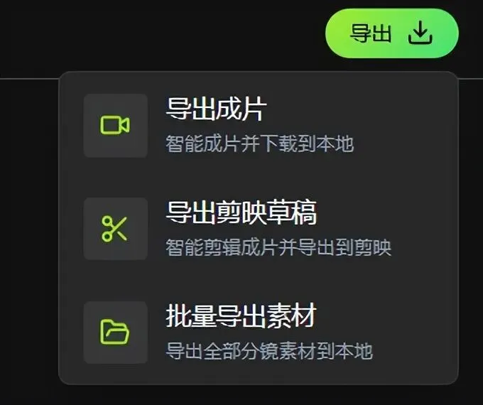 所有独立视频片段生成完毕后,进入成片环节。平台提供“批量导出” 功能,并支持一种对创作者非常友好的格式:导出为“剪映专业版工程文件”。