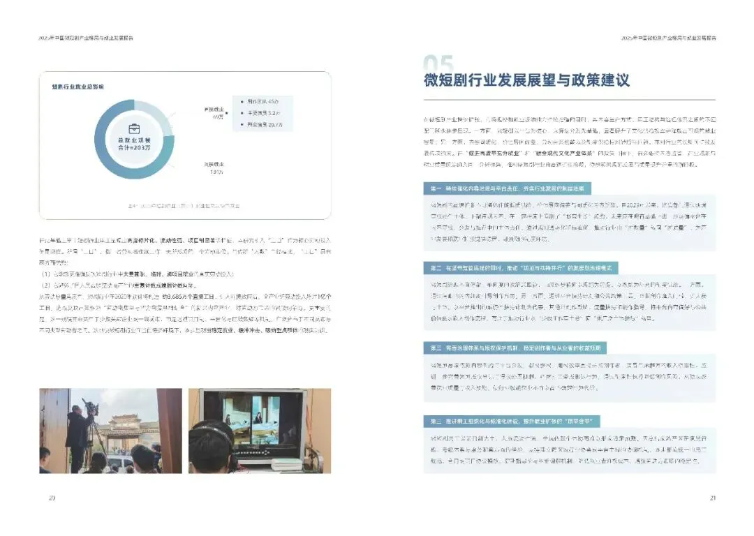报告还提出多项政策建议,包括强化内容治理与平台责任、推动规范与扶持并行、完善版权保护、推进用工标准化与薪酬指引、健全技能培训与社保适配机制等,以促进微短剧产业高质量充分就业和现代文化产业体系的健全发展。