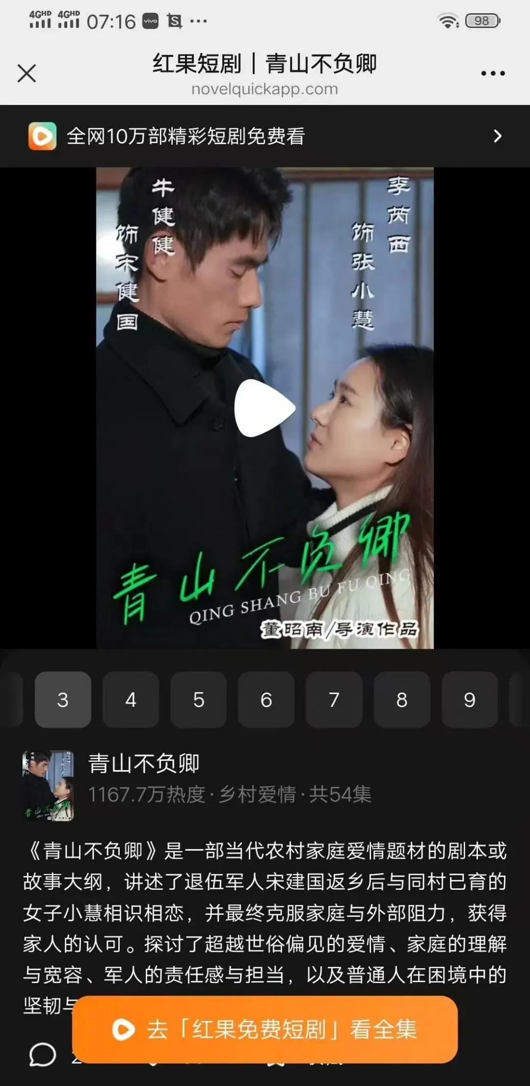 作为一部聚焦乡村家庭与爱情的微短剧,《青山不负卿》的价值不仅在于勾勒了一段动人的乡村爱情,更在于其透过故事传递出的深层内核,让超越世俗偏见的爱情、家庭的理解与宽容、军人的责任感与担当,以及普通人在困境中的坚韧与善良成为剧集的精神底色。剧中,宋建国与张小慧的爱情打破了乡村对单亲母亲的刻板印象,诠释了“爱无关过往,只惜真心”的情感真谛;宋父宋母的态度转变,则道尽了中国式家庭中亲情的包容与温暖,让家庭成为每个人最坚实的后盾;宋建国始终坚守的军人本色,让责任与担当成为其为人处世的准则,也让军人精神在乡土间得到别样诠释;而张小慧在生活磨难中从未放弃对美好的追求,更是普通人面对困境时最珍贵的生命底色。这些内核与乡村生活紧密相融,让剧集在讲述爱情故事的同时,更成为对乡村伦理、人性美好与时代精神的生动诠释。
