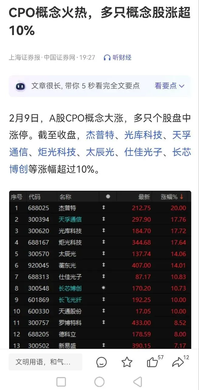 2月9日,A股CPO概念大涨,多只个股盘中涨停。截至收盘,杰普特、光库科技、天孚通信、炬光科技、太辰光、仕佳光子、长芯博创等涨幅超过10%。此次CPO上涨的直接催化因素是,美国东部时间2月5日,晶圆代工厂TowerSemiconductor宣布与英伟达(NVIDIA)合作开发用于AI数据中心的先进硅光子技术,旨在为符合英伟达网络协议的1.6T数据中心光模块提供支持。(CPO概念火热,多只概念股涨超10%,上海证券报.中国证券网)