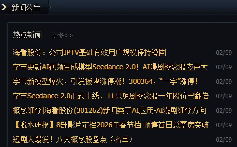 近日,字节跳动推出的Seedance2.0的AI视频生成模型刷屏,只需编写详细的提示或上传一张图片,Seedance 2.0 即可在60秒内生成带有原生音频的多镜头序列视频。这直接利好文生视频,最直接的概念是短剧和AIGC概念股。在机构人士看来,Seedance2.0有望在AI漫剧、AI短剧等短内容领域率先实现广泛应用。在Seedance 2.0突破性能力的带动下,2月9日传媒板块中文在线、掌阅科技涨停,影视股也跟着起飞。Seedance 2.0的能力跃升有望将进一步压缩制作周期,同时提升画质,升级为“类电影级动画”。通俗点讲,画质从“PPT”升级为“类电影级”动画。中文在线公司已推出AI绘画功能和AI文字辅助创作功能,其中AI文字辅助创作功能已上线。海看股份:公司正在布局微短剧项目,目前正在投流试运营阶段。捷成股份:公司加大在AIGC、版权监管领域的技术开发和应用力度。掌阅科技:公司积极推进AI大模型在数字阅读垂直领域的应用。博纳影业:公司已经进入AIGC(人工智能生成内容)短剧领域,并正在打造AI短剧。横店影视:公司持续关注短剧、微短剧的发展动态,已建立专门的团队负责短剧、微短剧业务。引力传媒:公司已推动AKF(《金猪玉叶》)、科施佳(《她从光中走来》)、斐乐(《双姝之战》)等多家品牌客户完成围绕短剧营销的项目合作。荣信文化:AI应用概念—根据2025年9月17日互动易:公司的儿童教育AI研究院依托公司丰富、专业化的少儿内容储备,根据《3-6岁儿童学习与发展指南》建立了儿童阅读行为标签体系。其实,短剧和AIGC概念早有异动,此前消息面上,Op enAI已通知多位广告主计划于2月初上线ChatGPT广告服务,初期按展示次数计费,并在免费及低价订阅用户中测试投放。随着春节的临近,A股影视院线板块近日出现明显异动。2月9日,影视院线板块强势走高。捷成股份20CM涨停,上海电影、横店影视、博纳影业、欢瑞世纪涨停。华智数媒、百纳千成、华策影视、华谊兄弟等跟涨。2月9日早盘,9:40,算力租赁板块延续强势,大位科技涨停,利通电子等跟涨。利通电子发布业绩预增公告,预计2025年归母净利润2.7亿至3.3亿元,同比增长近10倍,主因AI算力业务盈利大增。利通电子:603629:利通电子控股股东、实际控制人关于公司股票交易异常波动问询函的回复利通电子 . 上交所股票 . 2026-02-10关于江苏利通电子股份有限司股票交易异常波动问询函的回复公司发来的《江苏利通电子股份有限公司股票交易异常波动问询函》已收悉,经认真自查核实,现回复如下:本人作为江苏利通电子股份有限公司(以下简称"上市公司")的控股股东及实际控制人,不存在影响上市公司股票价格异常波动的重大事项,不存在其他应披露而未披露的重大信息,包括但不限于重大资产重组、股份发行、收购、债务重组、业务重组、资产剥离、资产注入、股份回购、股权激励、破产重整、重大业务合作、引进战略投资者等重大事项。政策上,工信部政策明确提出构建“1+M+N”国家算力互联互通节点体系。中华普研预测2026年国内算力租赁市场规模将达2600亿元,年增速超20%;光力科技今日涨停,资金聚焦半导体国产化逻辑。国泰海通证券深圳福田中心区华融大厦净买入4942万元。飞沃科技今日涨停。航空航天紧固件及发动机3D打印核心供应商【飞沃科技】30日线反弹。央视报道可重复使用航天器成功发射及马斯克宣布SpaceX将建月球城市,催化商业航天概念;国泰海通无锡湖滨路净买入1.71亿元,东吴苏州相城大道净买入1.55亿元,两家游资合计超3亿元。短线PK赛非常残酷,之前横店影视和天地在线一起PK,横店影视缩量上板,天地在线炸板,尾盘强封,后面就是走走停停,就没有横店影视走得顺。横店影视之前引发高标抱团,而短线一旦走弱不反包,则震荡出货。上周(20260202-20260206)板块行情 电力设备与新能源板块:上周涨幅居前五个股票分别为杭电股份 51.66%。华源证券认为光纤光缆景气度有望持续向上,看好相关公司业绩随光纤价格上涨改善。华源证券指出,光纤价格已经温和上涨了约半年时间,其中G.652.D裸光纤价格从不到20元/芯公里一路上涨,进入2026年后开始加速上涨。核心原因在于光纤供需的反转。此外,长飞光纤光缆旗下子公司在2月6日宣布,正式完成超10亿元A+轮股权融资。本轮融资由江城基金、长江产业集团领投,光谷金控、奇瑞旗下芯车智联基金等机构参投,融资资金将主要用于碳化硅功率半导体全产业链技术布局,加速抢占新兴领域全球市场。传媒主线
