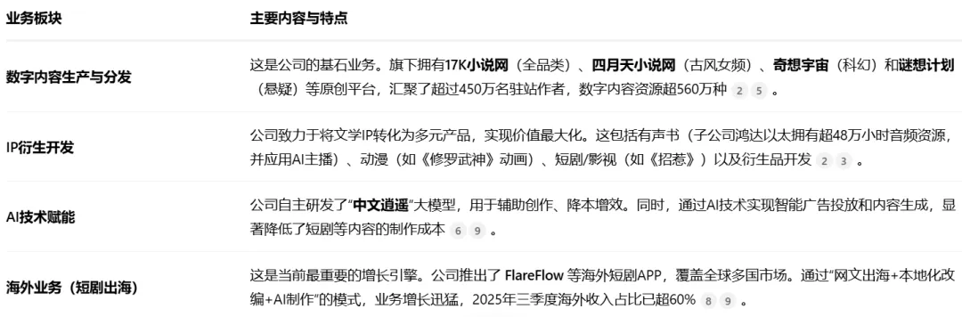 中文在线的业务围绕“文化+科技”战略展开,可以概括为以下几个核心板块: