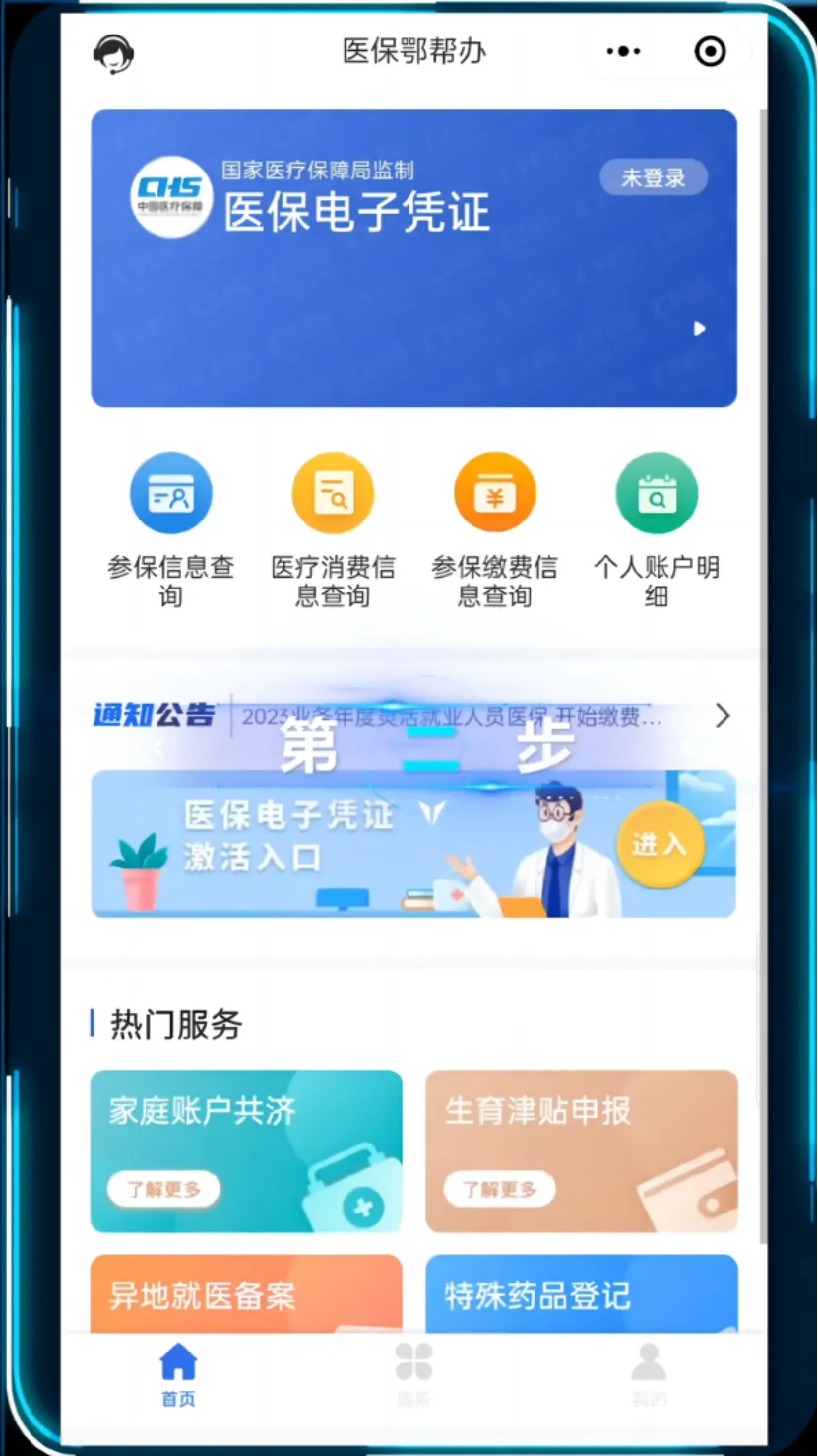 点击公众号服务栏“公共服务”,进入“医保鄂帮办”微信小程序。