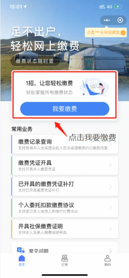 进入小程序,点击我要缴费按钮,进入缴费办理界面。