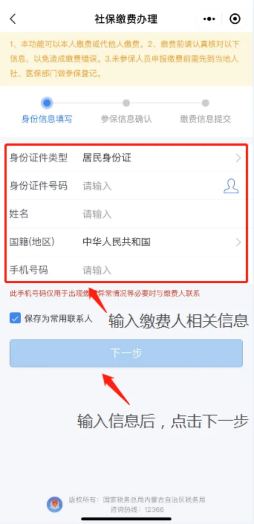 1.在本功能中,可以给本人进行缴费,也可以代他人进行缴费。