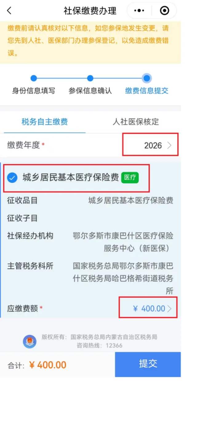 险种选择“城乡居民基本医疗保险费”,缴费年度选择“2026”,应缴费额选择“400.00”。点击“下一步”。
