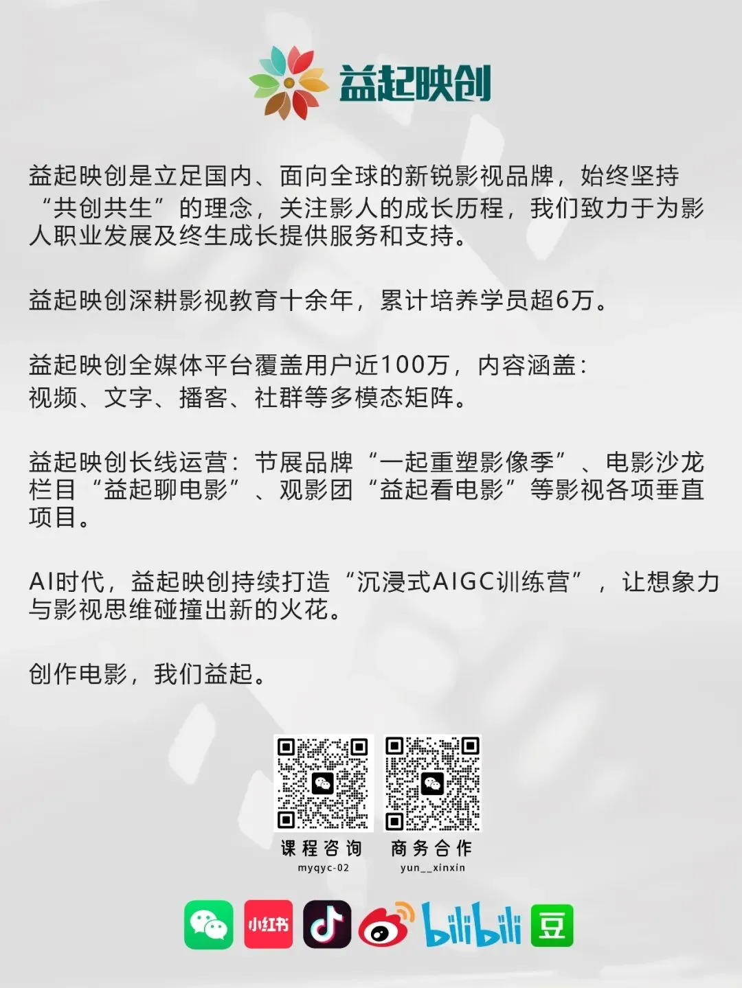 2026年是益起映创(原后浪电影)的第14个年头。虽然路不好走,但们仍将继续开发涵盖导演、编剧、摄影、表演、制片、剪辑、美术、AI创作、纪录片、影视创投等多领域课程,紧密对接学术和产业前沿、提供系统性学习路径,确保你学到的技能和片场正在以及即将发生的变革同步。