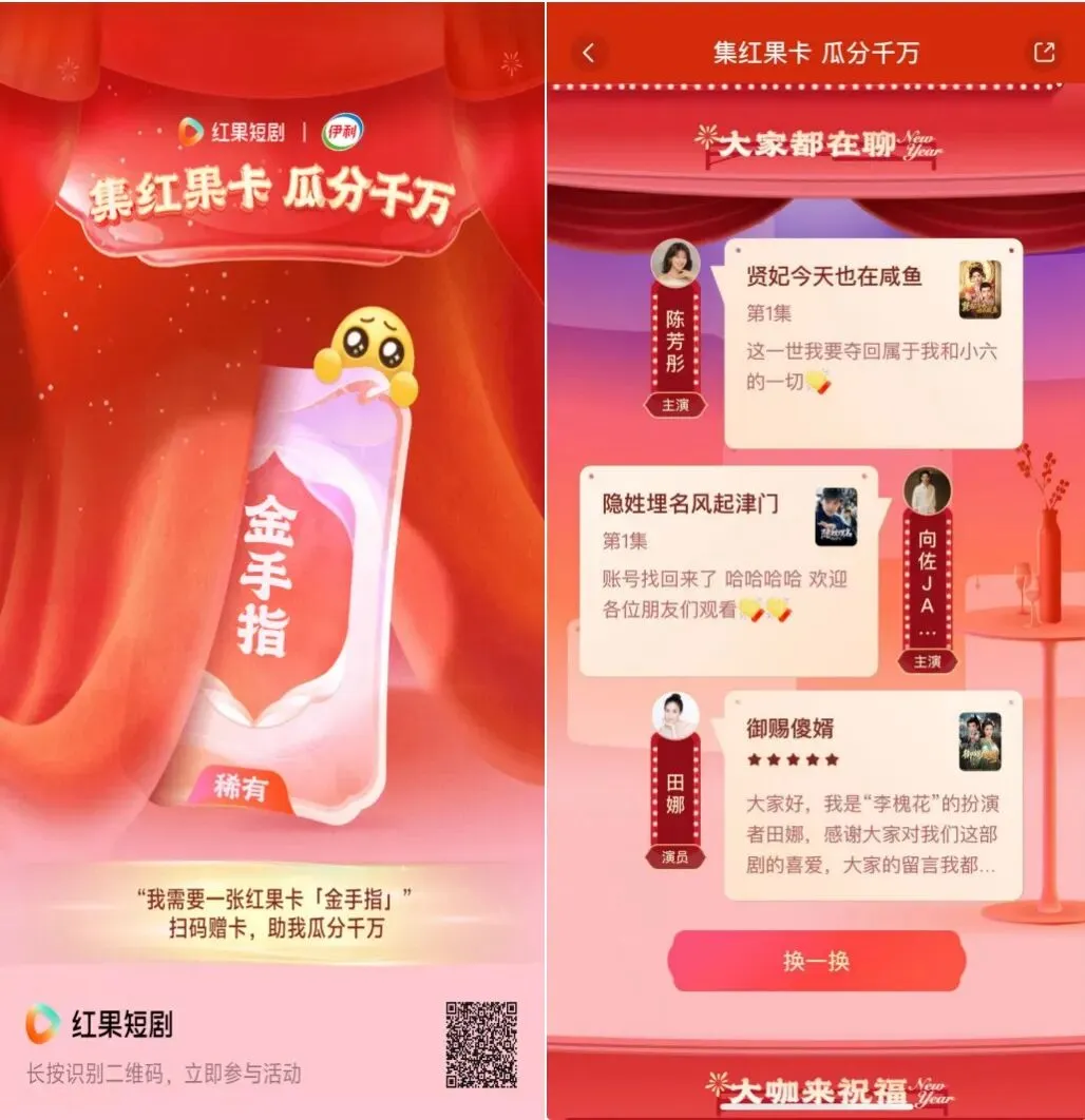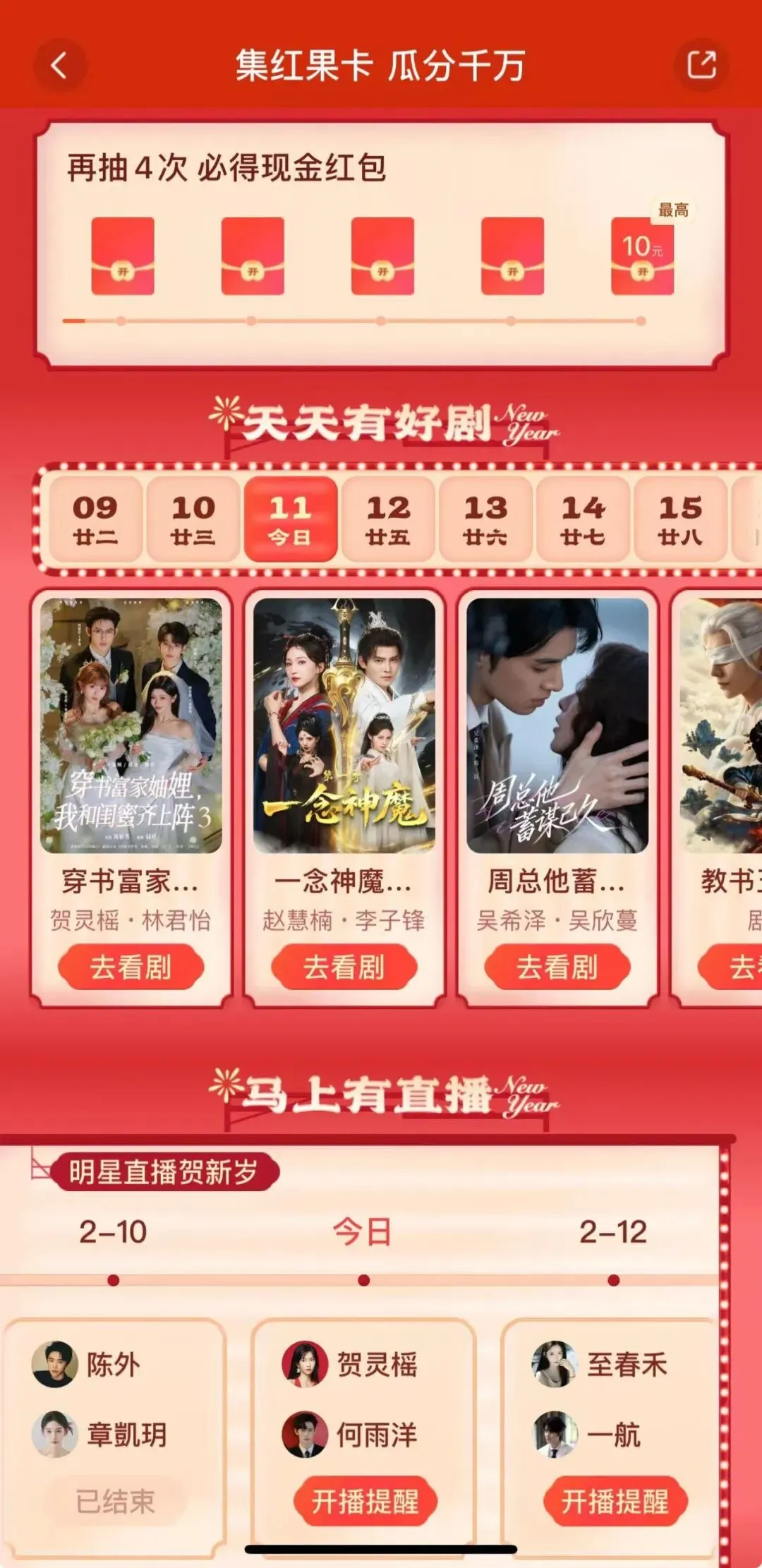 本次红果春节档以“集卡赢现金,千部好剧免费畅看”为核心,不仅打造了趣味十足的集卡福利活动,更集结24部优质片单、超千部短剧漫剧新作,搭配演员直播、明星互动、有奖正文、神评论大赛等沉浸式互动,为观众解锁 “看剧 + 玩梗 + 赢福利” 的新春新玩法。