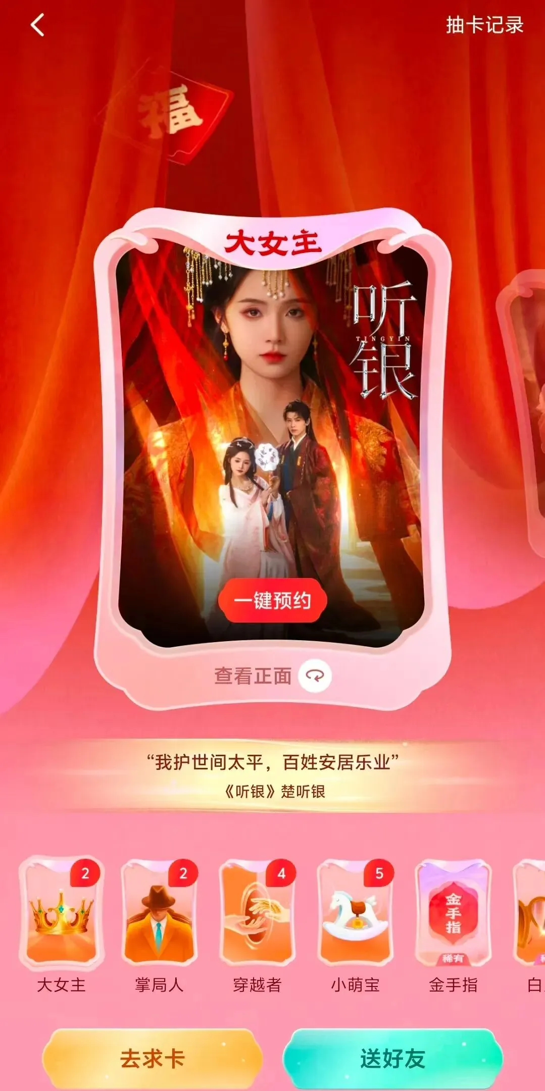 值得一提的是,本次集卡活动还分为“角色卡”与“剧情卡”两个阶段,每集齐一套卡面即可实现奖金金额翻倍,卡牌反转之后,背面还能开出剧集盲盒,边玩边解锁新剧,让春节假期彻底告别 “剧荒”。比如,大女主卡背面是《听音》;掌局人的背面是《天下第一纨绔》;白月光的背面是《玫瑰藏于盛夏》……