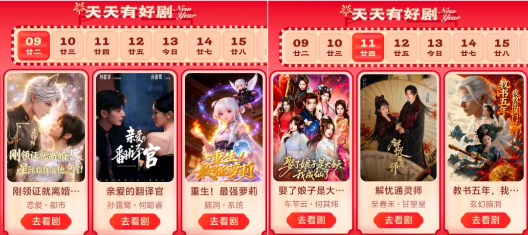 红果观剧日历是观众解锁这份观剧大餐的实用工具。日历覆盖了从腊月廿二到正月十一的核心观剧时段,同步标注了24部片单的上线时间、对应农历日期及核心看点,每日都有优质新剧上线,满足观众春节假期的持续观剧需求。观众在红果短剧 APP 内即可查看,提前点击预约,以便剧集上线第一时间解锁全集观看,彻底告别错过更新的遗憾。