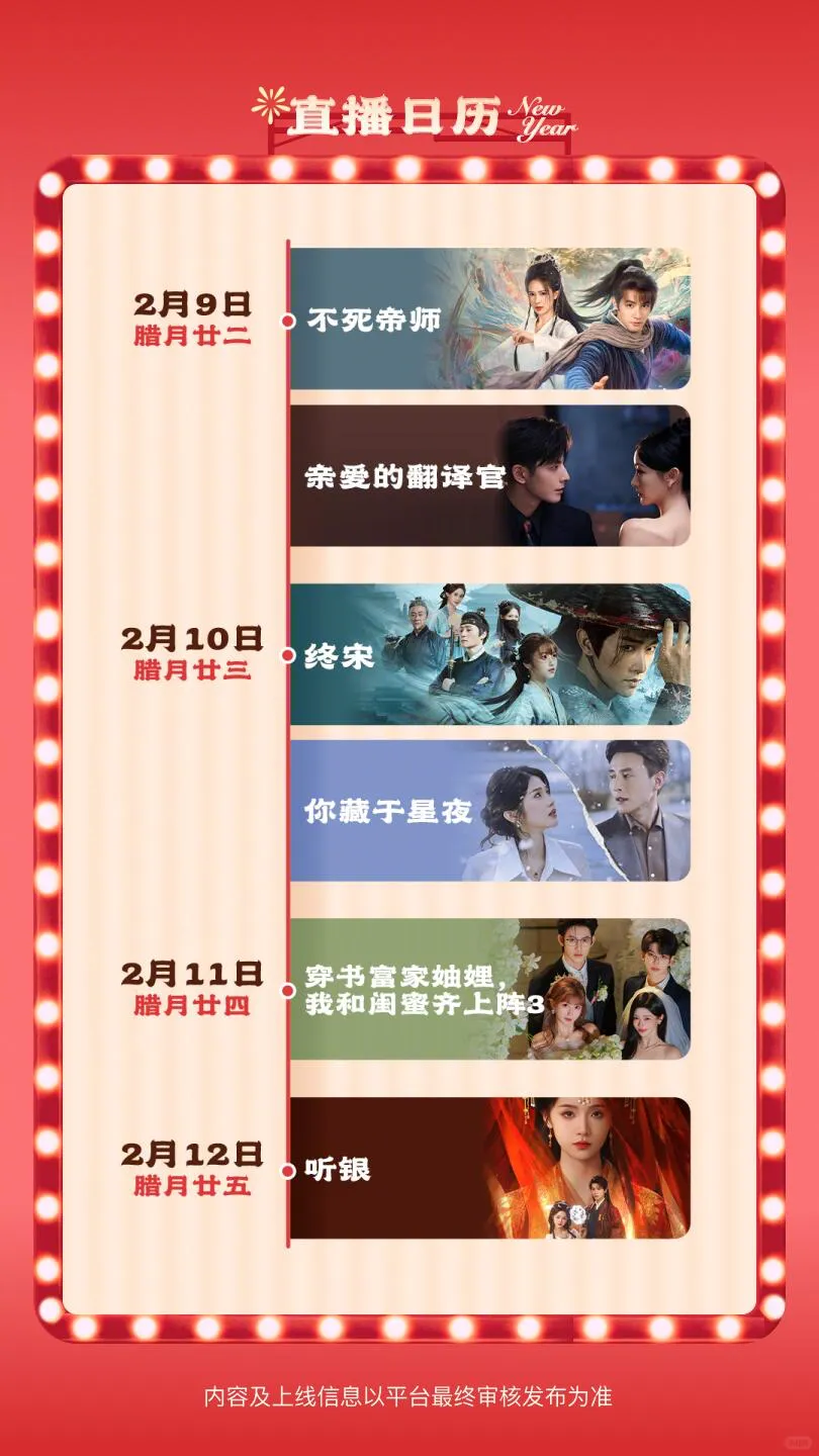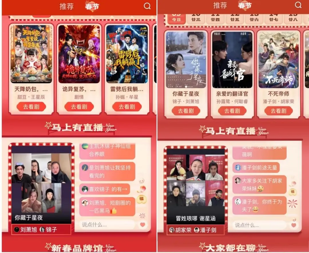 2月9日《不死帝师》《亲爱的翻译官》剧组率先开播;2月10日《终宋》《你藏于星夜》剧组接棒,刘萧旭、锦子等演员现身直播间,分享拍摄趣闻、现场演绎剧中经典片段,还与观众实时互动回应弹幕提问,刘萧旭的新春首播季更是收获91.8万本场点赞,直播间氛围火热;2月11日《穿书富家妯娌,我和闺蜜齐上阵 3》剧组开播,贺灵榣、何雨洋等主演与观众聊聊剧里剧外的故事;2月12 日《听银》剧组登场,为观众带来新春祝福。