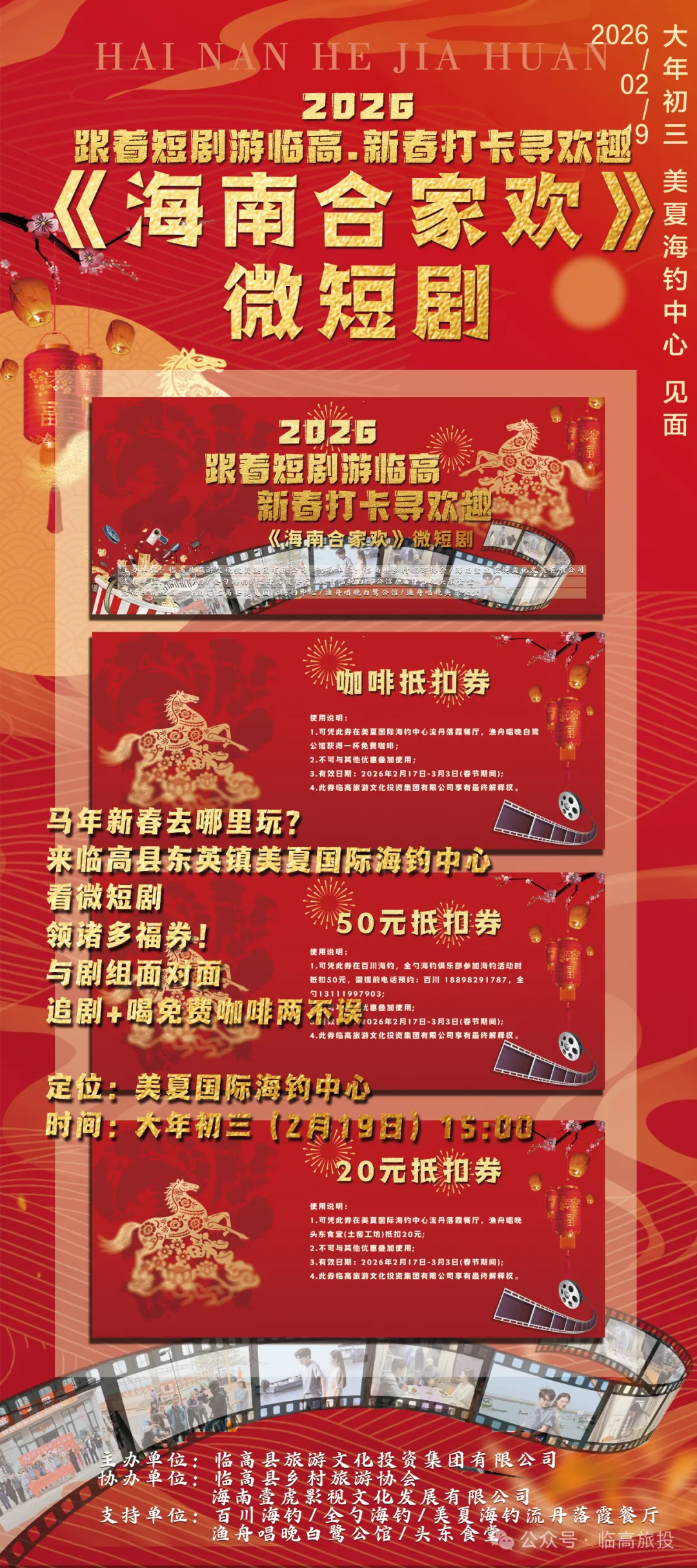 美夏渔村、美夏海钓中心、新盈渔舟唱晚头东食堂三大特色点位联动,把短剧里的烟火场景搬进现实,打卡集赞就能领咖啡、啤酒、土窑美食抵扣券,还有全民免费卡拉 OK 嗨唱到底,让你在临高的新春里,沉浸式感受渔家文化、滨海风光和本土美味的独特魅力~📍打卡点位,解锁短剧同款美好