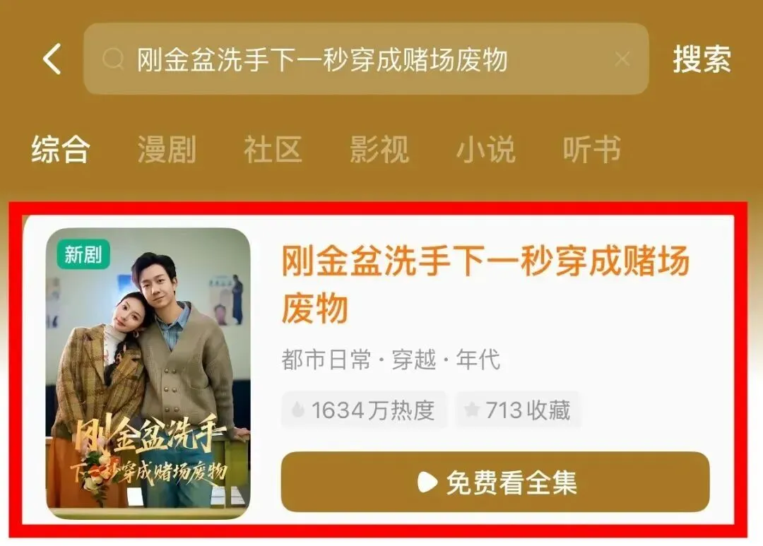 打开红果短剧、河马剧场、番茄免费小说APP,在顶端搜索栏输入《刚金盆洗手下一秒穿成赌场废物》点击搜索,便能快速找到精彩剧集。