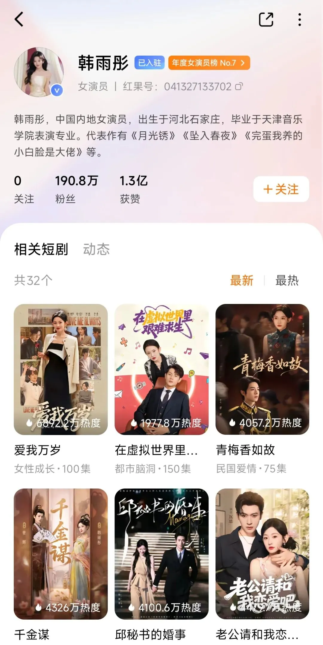 短剧演员韩雨彤:32部作品零烂尾,凭什么圈粉190万?