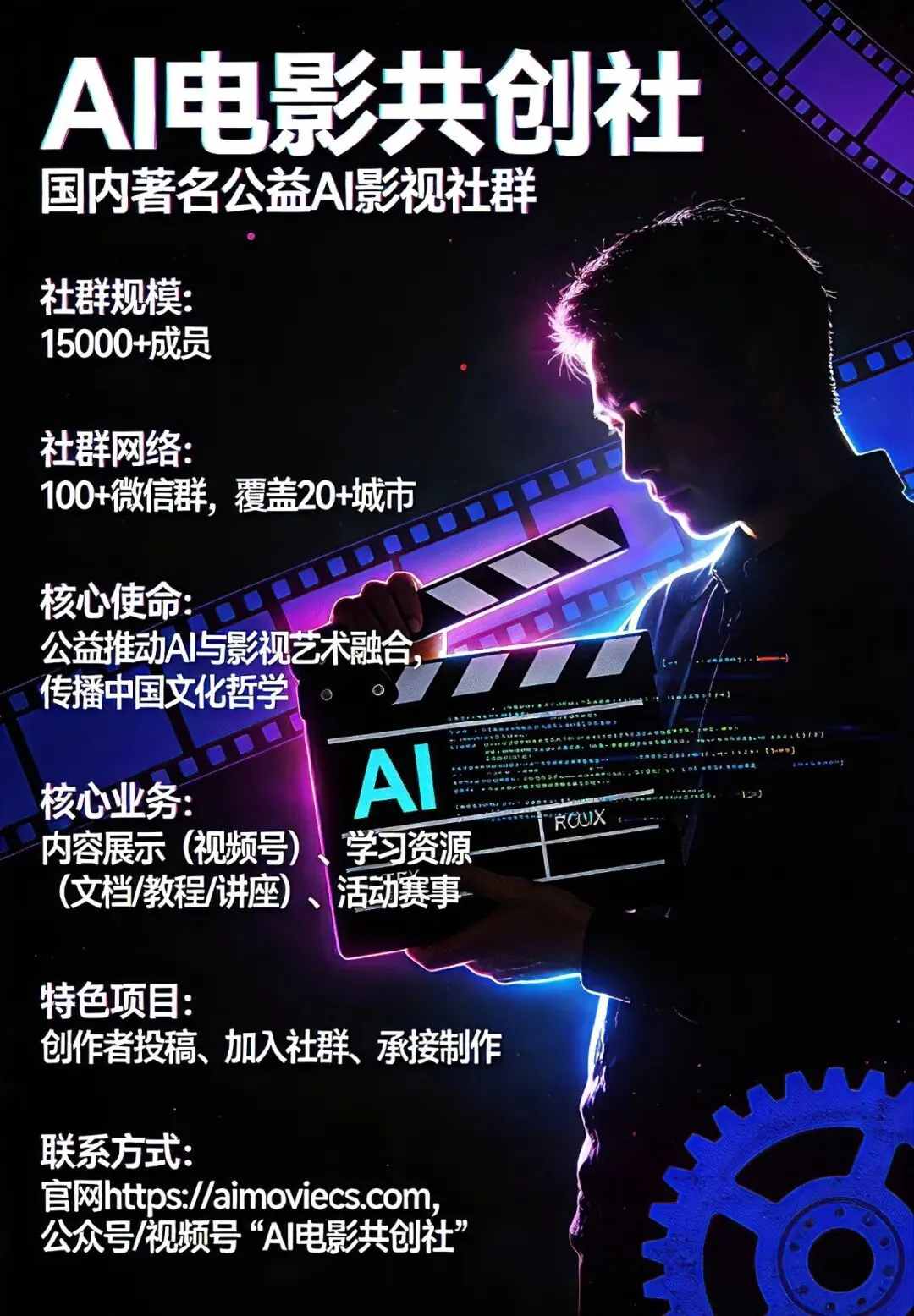 AI电影共创社:简称电影共创社,由陆再谋发起于2024年2月17日。国内著名的公益AI影视社群,社群超万人AIGC创作者,有多名国内著名导演、编剧、影视领域教授专家学者,有500多名AIGC专家。电影共创社引领并制作了一系列作品(视频号可见),欢迎您加入,一起共学共创推动中国AI影视发展。社群承接精品AI电影、AI短剧、漫剧、AI广告制作,与商家品牌共创发展。