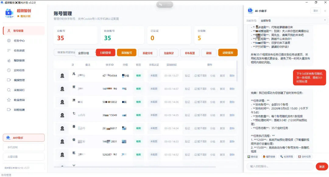 1电脑端方案:一台电脑绑定一个授权码,即可管理100个快手账号。素材缓存、原创化加工、自动排期发布、组件挂载——整条链路无需人工介入,也不用来回切换登录态,手动操作或交给Ai小助手