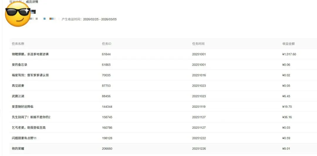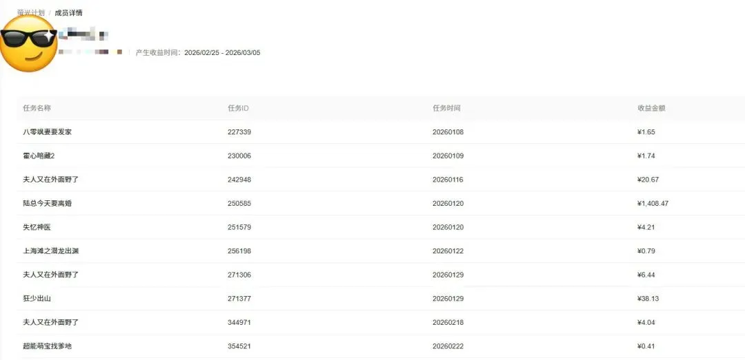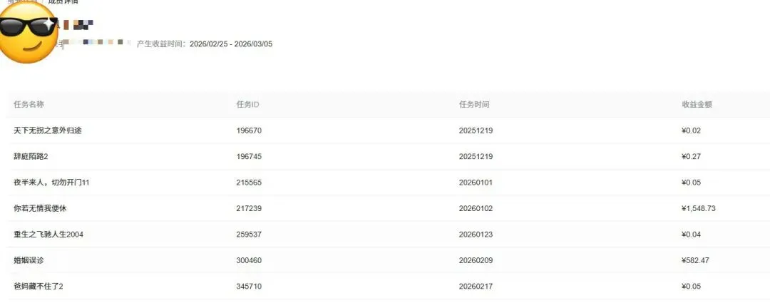 来算一笔账:短剧品类天然自带高流量属性,我们赚的又是广告触达分润,转化链路极短。哪怕一个账号整月都没出爆款,光靠自然推荐的基础曝光,单号月产出也能稳定在300到500之间。