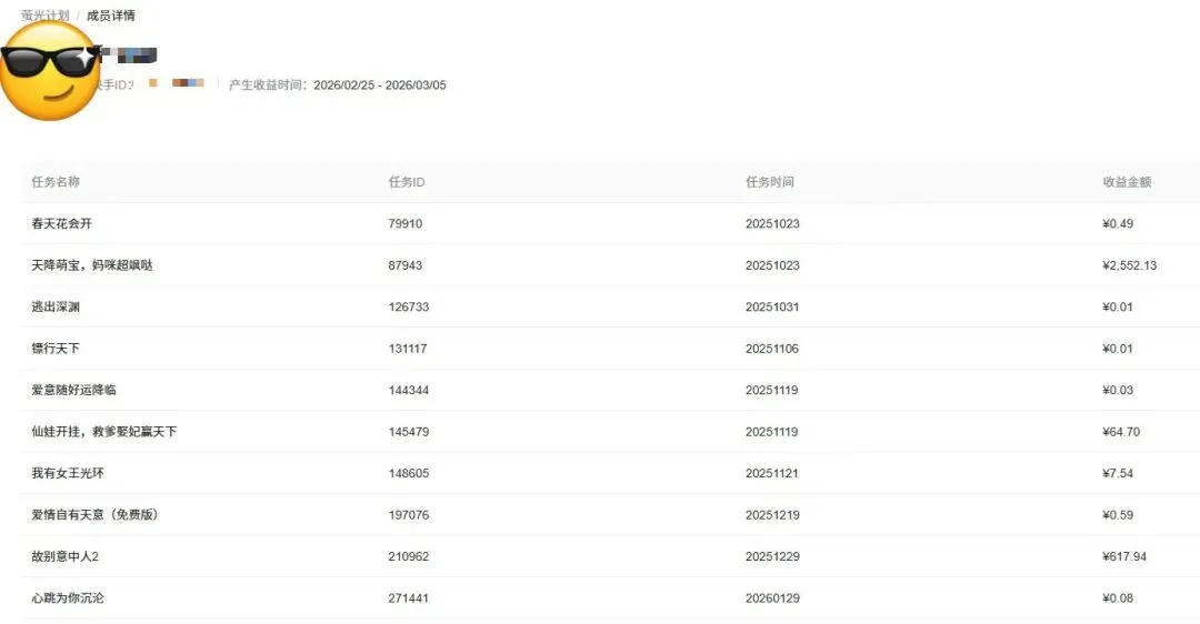 早在一月下旬,团队就拿到了快手最新内测的"萤光计划"——一个专注短剧与漫剧赛道的创作者变现扶持体系。截至目前,整个互联网上拿到这张内测入场券的机构,算上我们总共只有两家。