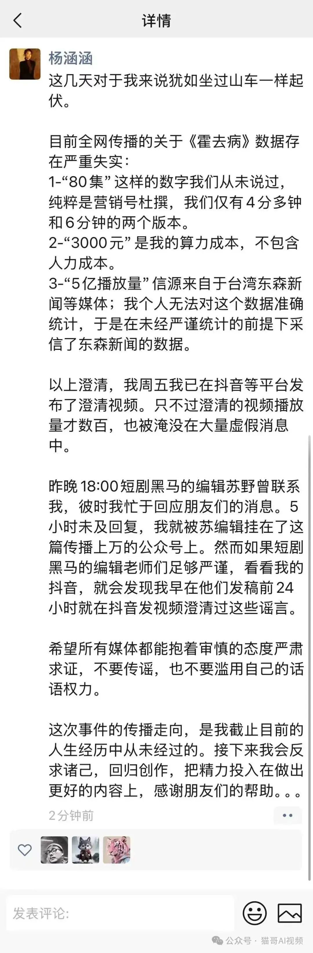 但作为长期关注AI创作的博主,我越看越不对劲——这4分钟左右的短片咋就成了80集短剧?直到看到导演杨涵涵的朋友圈澄清,才知道这场“神话”全是营销号杜撰的闹剧。