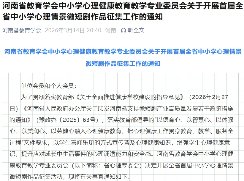 为了贯彻落实教育部《关于全面推进健康学校建设的指导意见》(2026年2月27日)《河南省人民政府办公厅关于印发河南省支持微短剧产业高质量发展若干政策措施的通知》(豫政办〔2025〕63号),落实教育部倡导的“以德育心、以智慧心、以体强心、以美润心、以劳健心融入心理健康教育,把心理健康工作贯穿教育、教学、服务全过程”文件要求,以学生喜闻乐见的方式宣传普及心理健康知识,增强学生心理健康意识,提升应对成长中生活事件的心理调适能力和安全感。河南省教育学会中小学心理健康教育教学专业委员会(以下简称:省心理专委会)决定开展全省首届中小学心理情景微短剧作品征集活动,现将有关事宜通知如下: