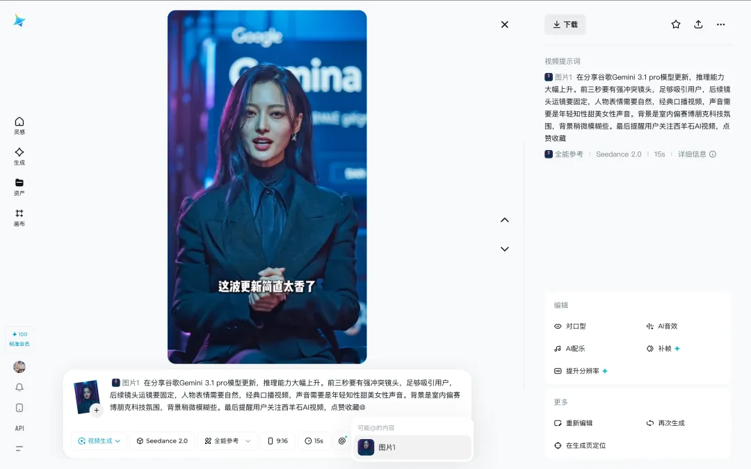只要提前准备好角色和场景的资产图,直接输入提示词就能生成完整的视频片段,自带运镜切换、自带台词口型、自带环境音效。