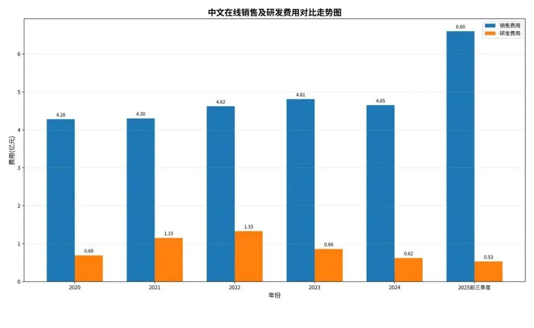 而与之形成鲜明对比的是,其研发投入捉襟见肘。数据显示,中文在线的研发费用由2022年的1.33亿元高位逐年降至2024年的仅0.62亿元,占总营收比重由11.27%降至5.35%。2025年前三季度更是只有0.53亿元,不足销售费用的十二分之一。