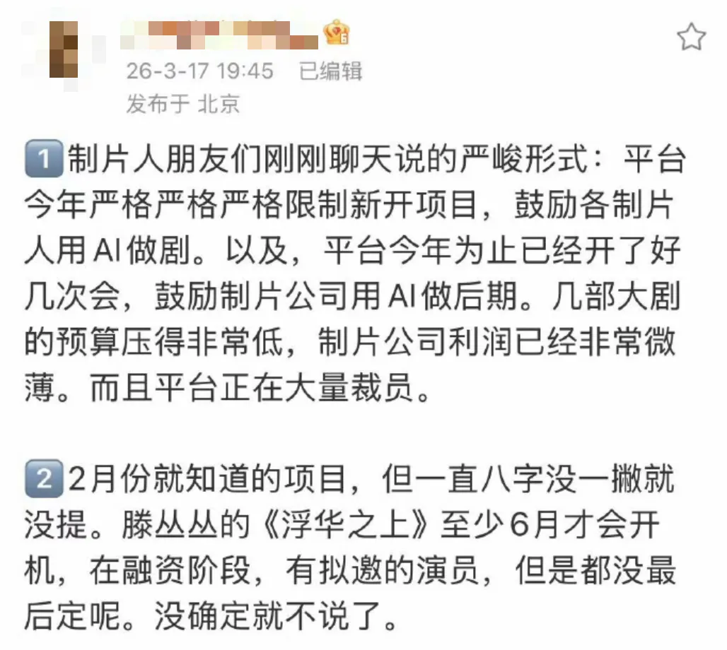 就在这个节骨眼上,一个听起来像段子的说法上了热搜——“以后男二以下都用AI”。很多网友的第一反应很一致,有人觉得离谱,有人直接说不信,还有人觉得纯属编故事。但真正值得注意的是,这件事并不是靠“相信”与否来决定的,它更像是一种已经在发生的变化,被提前说破了而已。