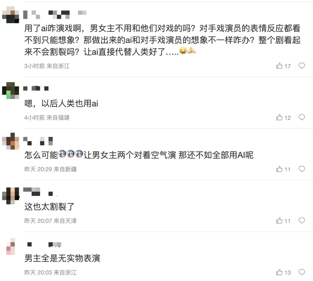 网友评论折射社会心理:有人说“男主演技必须更好才能对着空气演”,有人调侃“未来连收视率也AI算了”。观众、演员和制作方都在经历心理适应期,整个行业生态结构正在被重塑。