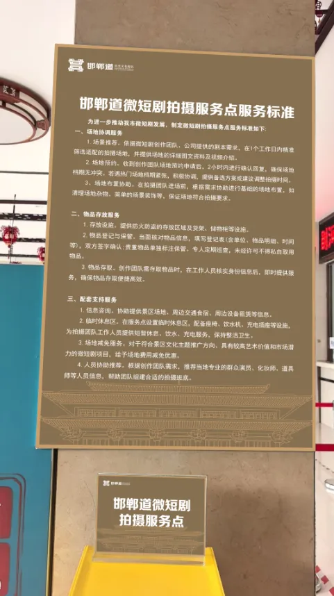 我市立足赵文化、红色文化、成语文化等特色资源,分两批梳理推出80个微短剧创作拍摄地,覆盖邯郸道、丛台公园、市博物馆、邯郸大剧院、新世纪中心等重点景区、文化场馆及商业综合体,涵盖历史文化类、现代都市类、文化艺术类等多元类型,可满足古装、都市、文艺等不同题材微短剧拍摄需求。目前,所有拍摄地均已完成服务点设立,明确服务规范,为剧组创作提供场地对接、后勤保障、场景协调等“一站式”落地服务,有效降低本地拍摄成本。