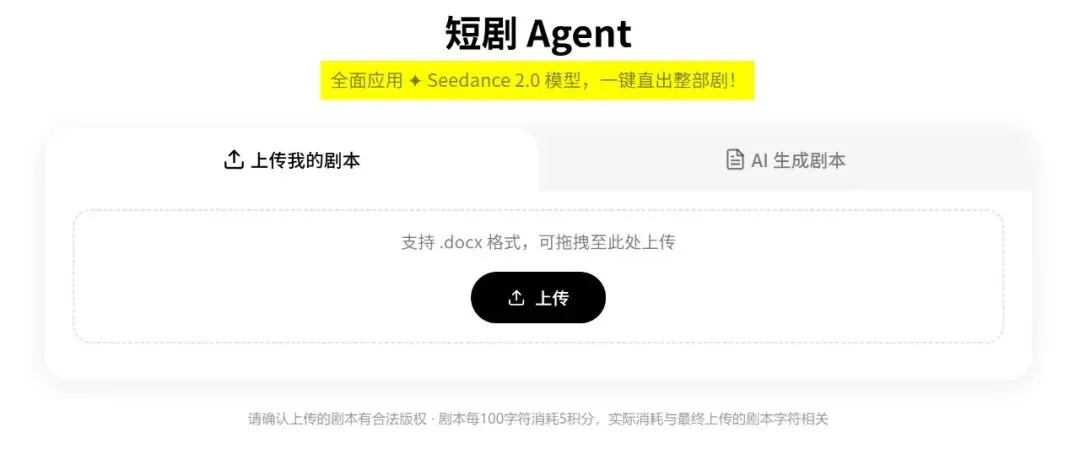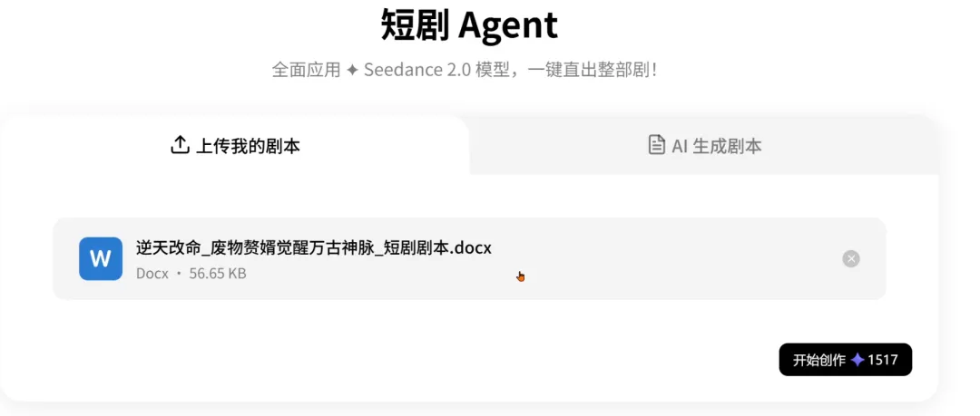 它应该也是第一个背后搭载了最强的Seedance 2.0 的短剧Agent, 主打的就是从剧本到成片,一步直出!端到端的Agent!