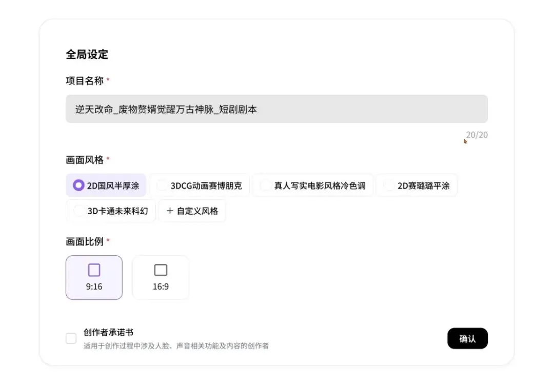然后Agent会进一步确认需求:项目名称、画面风格、视频比例。