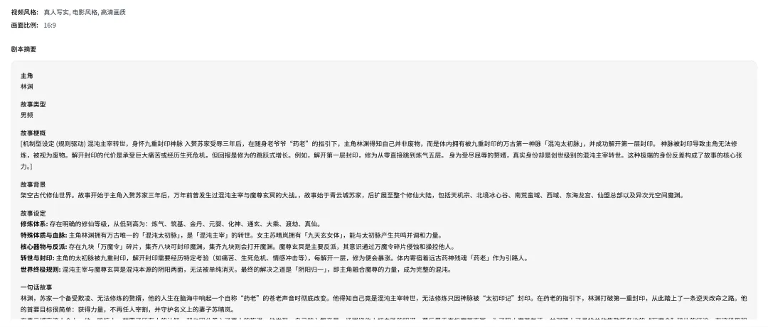 配置确认后,它就会按每一集几十秒,或者是一分钟左右的一个节奏,生成一份剧本大纲,这一步其实是会保留我们的剧情,同时会让它更像一个影片。