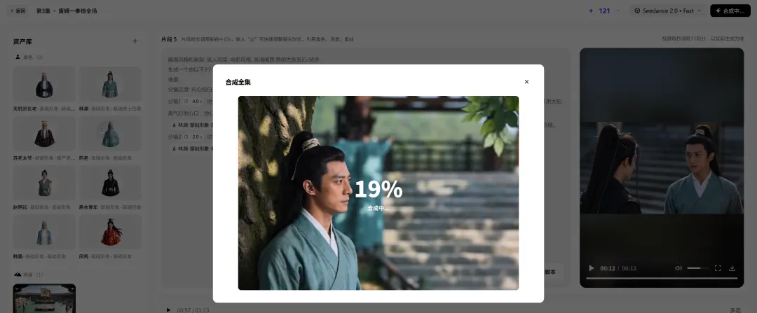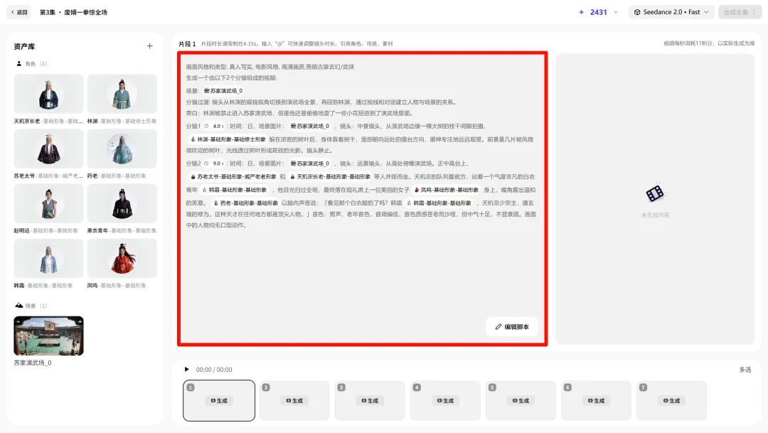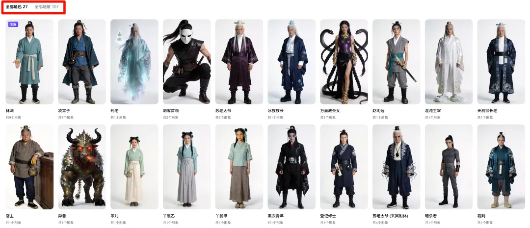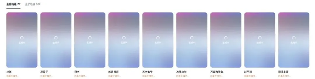接着它就会帮我们选角和选景,把所有角色的形象照、场景都生成出来。