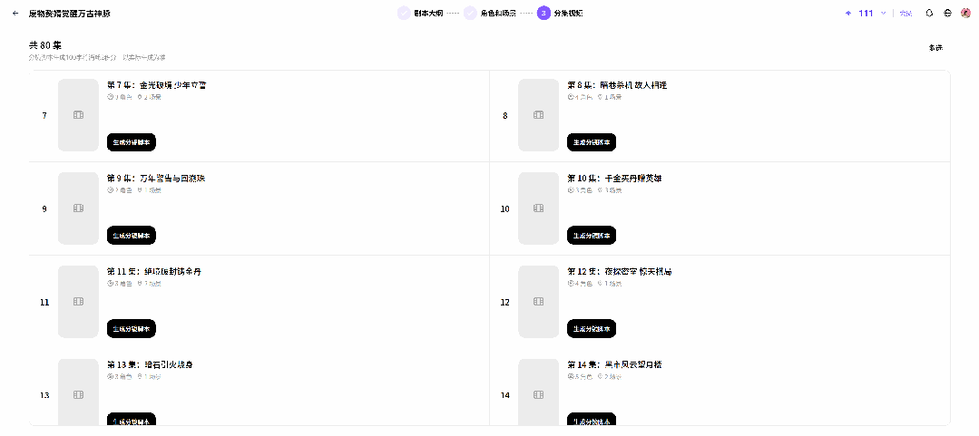 OK,场景和角色定好之后!我们就可以去挑集数,现在它八十集其实都已经列出来了,
