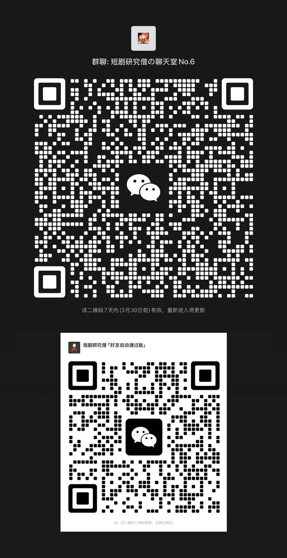 由于微信设定「扫码进群」的人数限制,【1、2、3、4、5群】目前已无法通过扫码加入,想进【前面的群】可以私聊小僧「进群」后受邀进入(同时表明身份比如“承制”“编剧”等会优先安排进前面的群),或者也可以直接扫码进入【6群】。