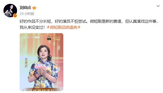 “2026微短剧品质盛典”日前颁出各项荣誉。盛典完整版于3月22日登陆东方卫视黄金档。作为中国影坛的传奇人物,从业五十余年的刘晓庆,也在年过七旬之际开启微短剧事业发展,摘得“品质荣耀演员”。她表示:“我在5天之内背完了80集我的角色的台词。我的努力,使我要求我的作品部部经典。所以拿到这个荣誉,充分证明你们的选择是对的,我没有让大家失望。” 昨日,刘晓庆在个人账号上晒图并称:好的作品不分长短,好的演员不怕尝试。微短剧是新的赛道,但认真演戏这件事,我从来没变过!2月14日,据媒体报道,75岁的刘晓庆接受采访时称,马年要拍10部短剧,她说:“2026年我的工作安排已经排满了”。