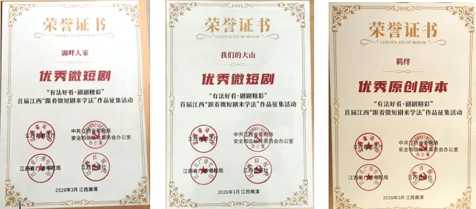 我市修水县司法局作品《湖畔人家》、浔阳区司法局作品《我们的大山》荣获全省优秀微短剧,彭泽县司法局作品《羁绊》荣获全省优秀原创剧本。