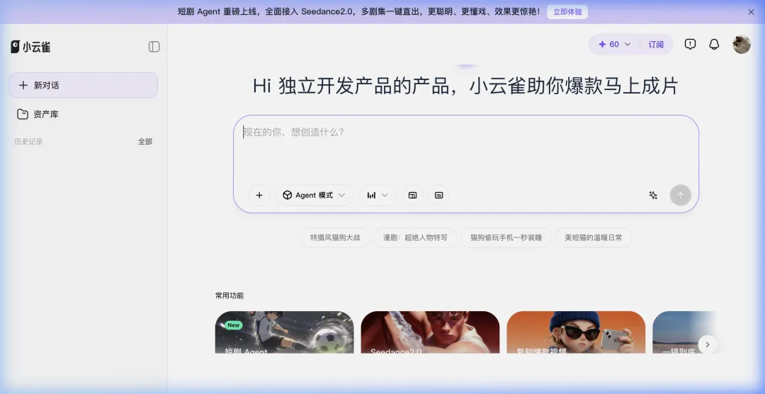▲ 小云雀首页:Agent模式 + 短剧Agent功能入口