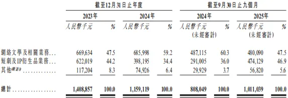 但中文在线两大核心业务的毛利率却都在不断下滑。招股书中显示,该公司网络文学及相关业务毛利率从2023年的40.6%降至2024年的24.4%,2025前三季度略回升至31.5%;短剧及IP衍生品业务毛利率由2023年的44.6%一路下滑至2025前三季度的34.4%。