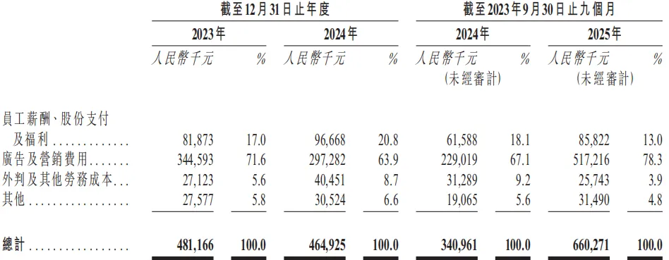 报告期内,该公司销售费用分别为4.81亿元、4.64亿元、6.60亿元,2025年前三季度同比增长93.65%,占总营收比重高达65.31%。公司在招股书中表示,2025年销售费用增加主要因为FlareFlow业务的启动,用于海外短剧业务的推广买量。