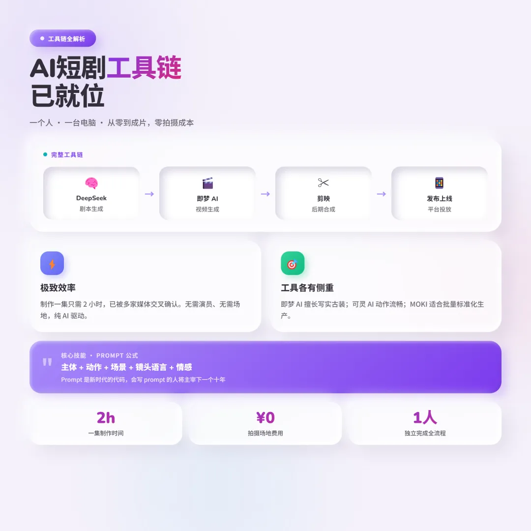 整条工具链长这样:DeepSeek 等 LLM(大语言模型)负责剧本生成,即梦 AI、可灵 AI 负责视频生成,最后剪映或 CapCut 做后期合成。一个人,一台电脑,从零到成片。以主流的 DeepSeek + 即梦 AI 组合为例,适合制作 3 分钟以内的短片,全程零拍摄成本,无需演员,无需场地。